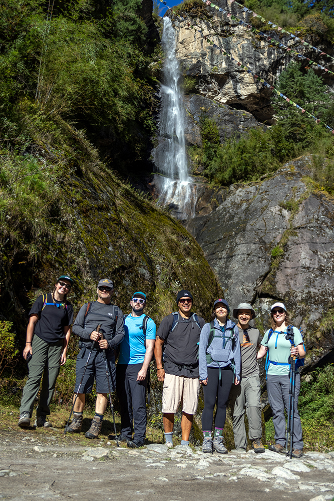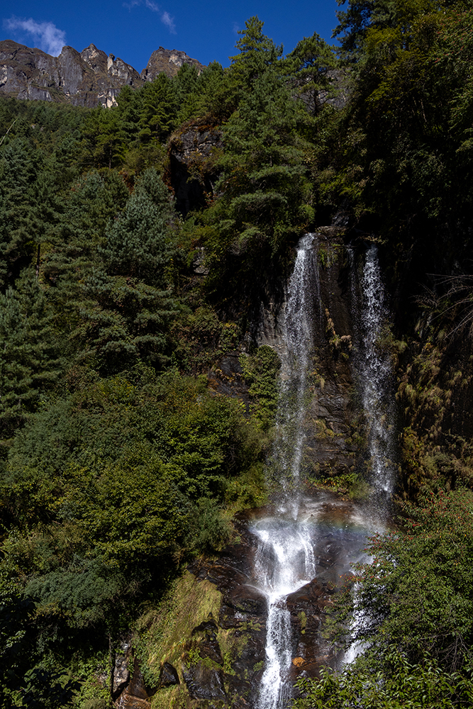 Unlike yesterday, the trail to Namche was uphill most of the way. In the morning, we passed under a couple of astoundingly tall waterfalls, as rainbows danced in their mist.