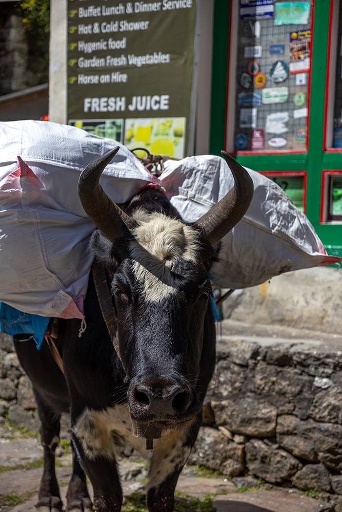 Just as the rain eased up, we encountered our first train of yaks, or rather half yak/half cow hybrids. They were transporting goods between villages, and their arrival was portended by a gentle ringing of cow bells. The sound gave us enough warning to all get over to the mountain side of the trail so we wouldn’t be toppled down the slope as the large animals lumbered passed us. The yaks became a common sight along the trail, along with mules and horses, and I was happy to see them every time they appeared.