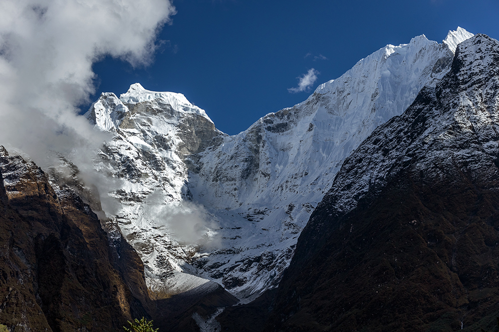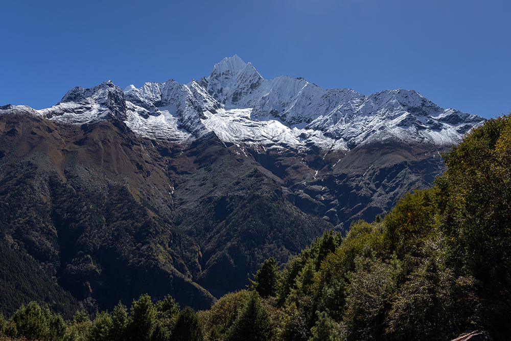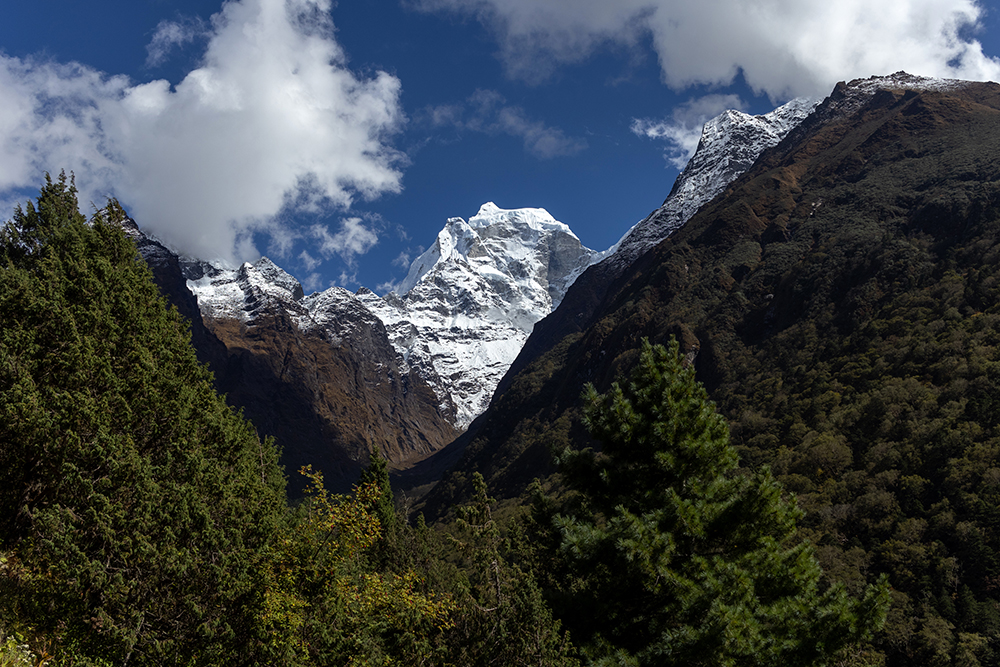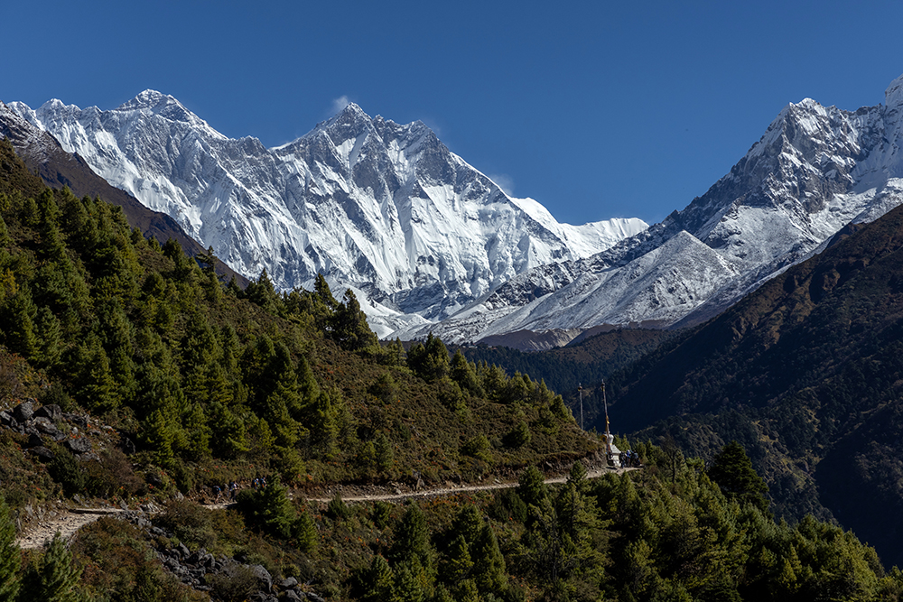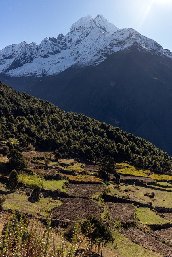 But as unique and beautiful as Namche is, there would be plenty of amazing places to experience as we ascended higher through the Khumbu Valley, and after breakfast we started walking, bound for Tengboche. The trail climbed uphill until we reached the outer limits of Namche, where we got one last sweeping view of the village before continuing along a relatively flat path. This was a welcome break from hill climbing, and we could also see some impressive peaks on the other side of the valley.