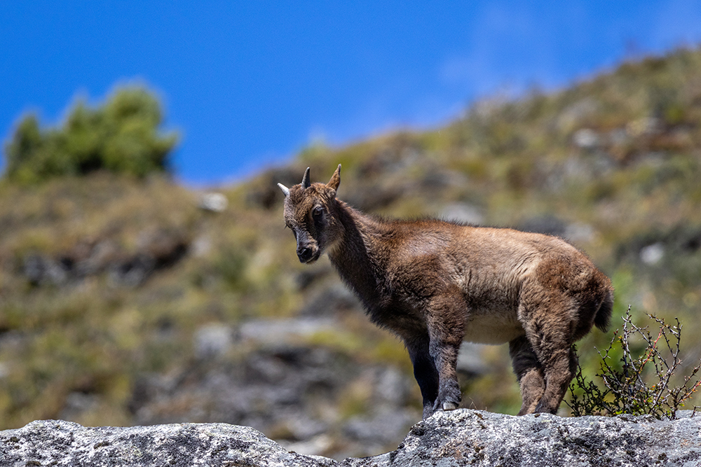 When we’d all finished up our tea, we got back to walking, and before long, Mahesh stopped in his tracks, and pointed up ahead on the trail. There was a brown goat standing on top of a huge boulder just above the trail, and Mahesh simply said, “Himalayan goat.” Immediately, I slung my backpack from my shoulder, and fished my zoom lens out, quickly attaching it before hurrying to get a bit closer.