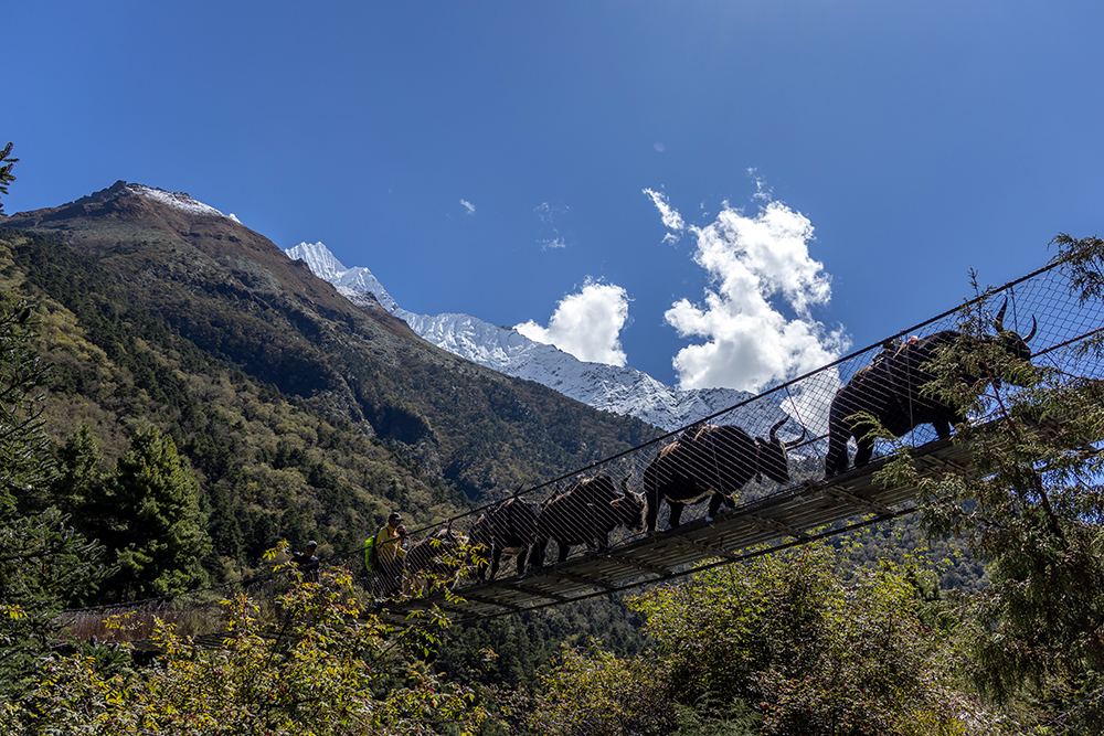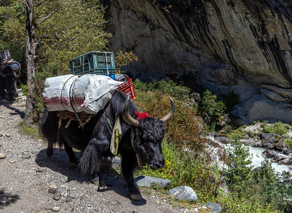 Unfortunately, we couldn’t keep watching the goats forever because we still had a lot of distance to cover. PG and Mahesh got us all moving again once we’d had plenty of time to snap some photos, and soon it was time to descend down to the river. To be completely honest, it felt a little tragic to have to lose all of that hard-won elevation. The descent was steep, which implied that the climb on the opposite side of the river would be steep as well. We did however, get to see our first full yaks at the bottom of the hill. These were much fluffier (and therefore cuter) than the yak hybrids we’d encountered until this point, and I told myself that this made the hills worth it.