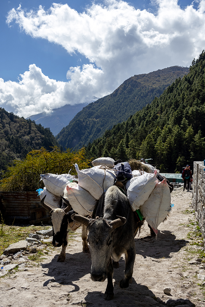 By late morning, it was time to stop for tea, and we did so at a very busy restaurant with lots of outdoor seating, and a perfect, panoramic view of the surrounding mountains. I sipped on a cup of masala tea, as PG pointed to a hill just across the valley from us. We could just make out a cluster of buildings that were in fact, the village of Tengboche. That’s where we would spend the night, but PG explained that we would have to descend back down to the river, and then climb all the way back up the other side to reach the hilltop village. But hey, what was one more giant hill climb at this point?