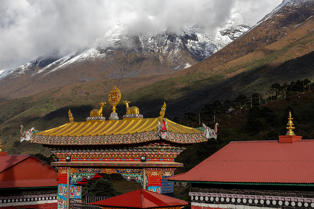 A feeling of peace settled over me the moment I caught my first glimpse of Tengboche. The village itself was just a handful of buildings surrounded by a landscape of the most beautiful mountains I’d ever seen. But despite the dramatic surroundings, the focal point of Tengboche was its monastery. Decorated in intricate carvings and bright gold and red paint, the monastery’s gate intrigued me as we walked passed it on the way to check into our tea house. Thankfully there was still plenty of time to go back for a visit after we dropped off our bags.