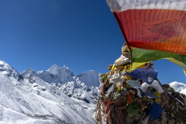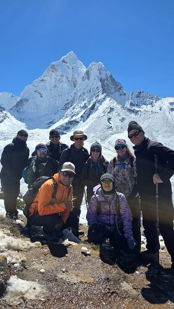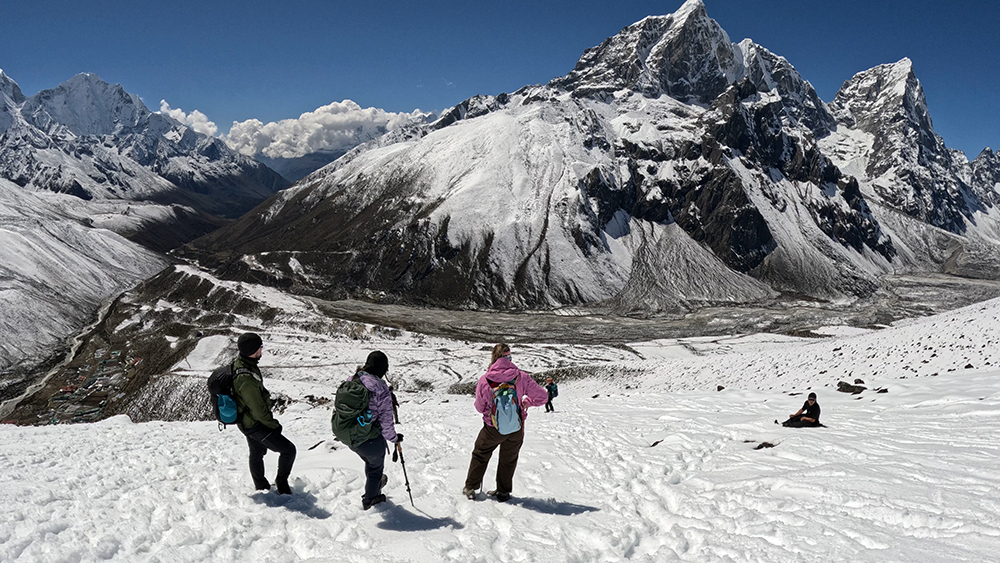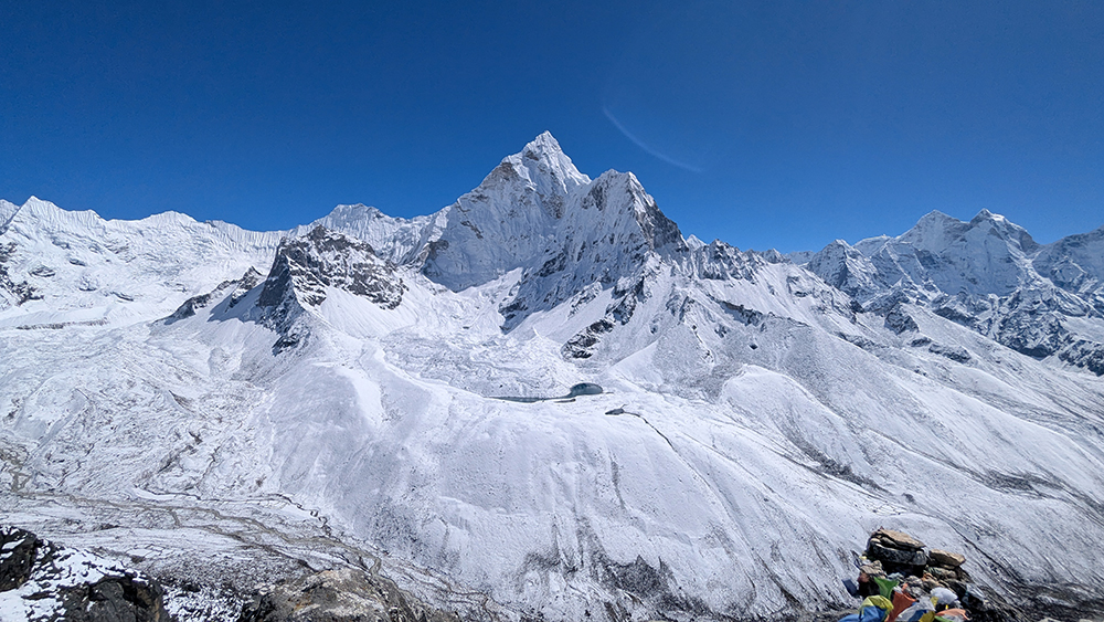 Despite having to splash through slippery mud, the whole team eventually made it up to the optional turn around point, where a large rock covered in prayer flags marked the trail. The flags rippled in the wind as PG reiterated what was to happen next. We all had to wait at the rock for twenty minutes for acclimatization. After that, he was going back down to Dingboche with anyone who didn’t want to keep climbing. Anyone who did want to try for the summit could press forward with our other guide, Mahesh.