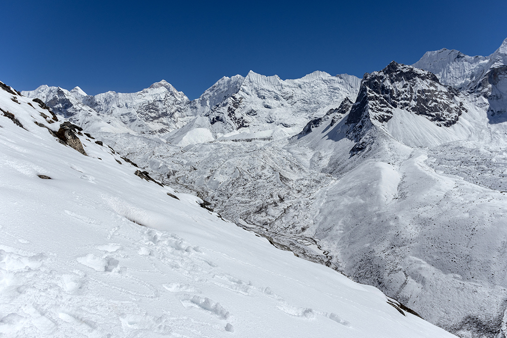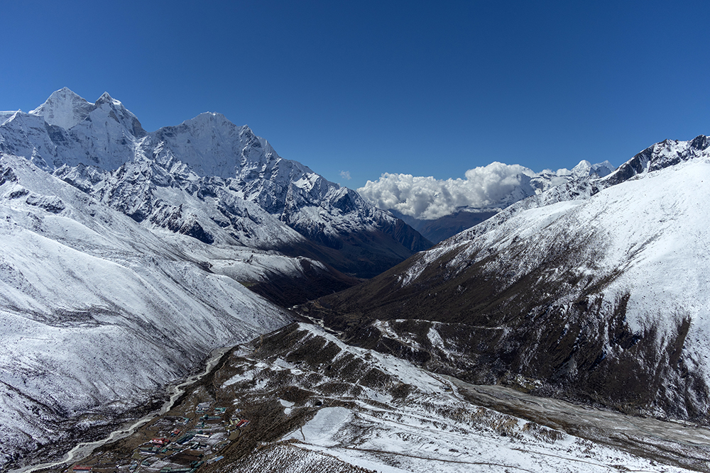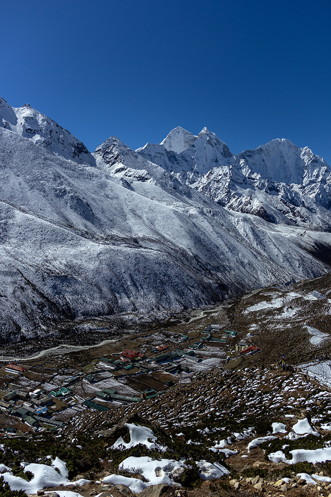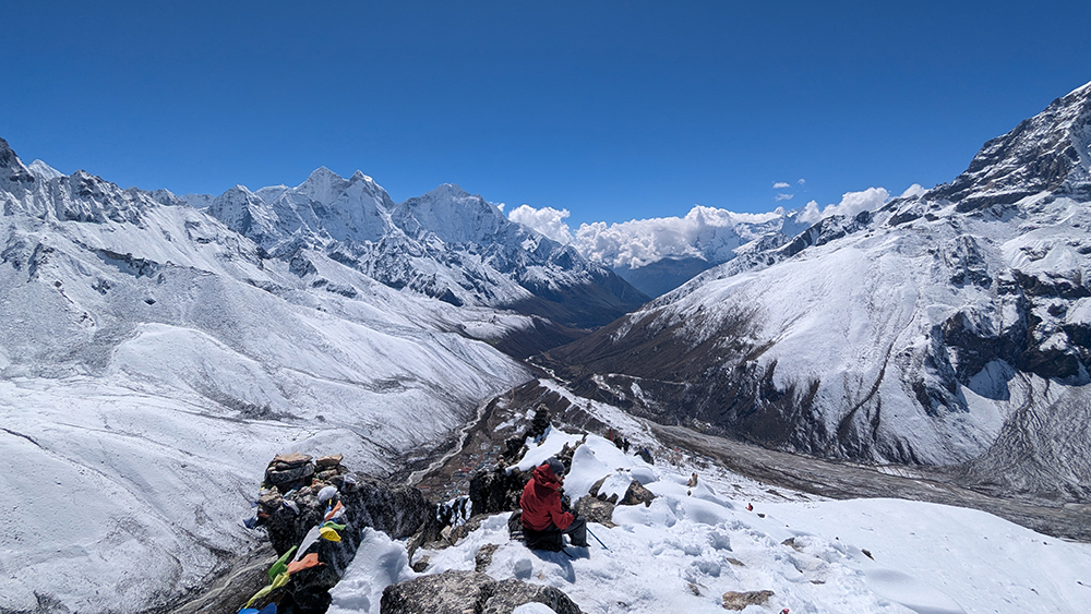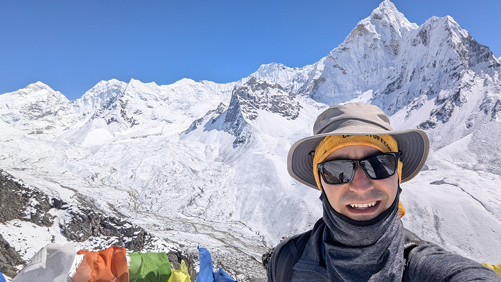 After breakfast, we got onto the trail right behind our teahouse and started climbing. The task was ostensibly simple enough. All we had to do was keep walking uphill until PG told us we could go back down. This may not seem like much, but above 14,000 ft, every step was a mountain in itself. I’d felt so strong throughout the trek so far, and I couldn’t help but feel humbled as I wheezed and stumbled my way up the side of Nangkartshang. But even as I struggled, I was still able to appreciate the unbelievable scenery that sprawled out in every direction. Of course, the sight of Ama Dablam towering over Dingboche was impressive, but my eyes were also drawn to the jagged ridges of Taboche and Cholatse, which rose above the village of Periche.