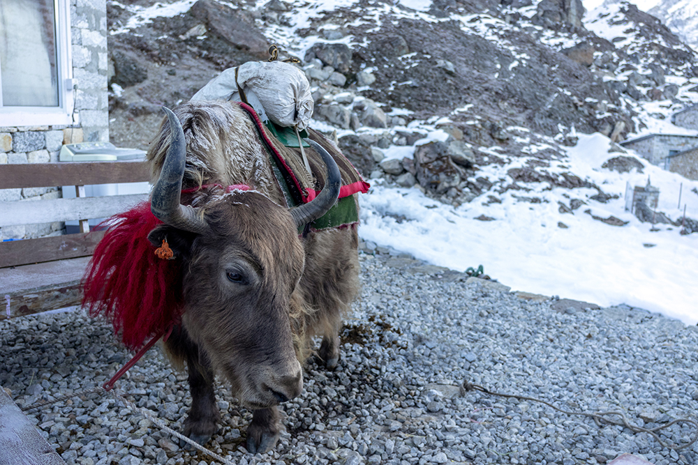 I must have accomplished most of these tasks, save for the bit about breakfast, because just as the sun was beginning to creep out over the valley, I found myself outside of the teahouse and face to face with a bunch of yaks. I know I was face to face with a bunch of yaks because I have pictures of it. They’re date stamped, October 14, 2025 and everything. I don’t remember them. In fact, in my memory, we left the safety of the teahouse under the cover darkness. In my memory, we walked at least an hour shrouded in night before the sun finally broke over the valley. Evidence suggests that my memory is wrong.