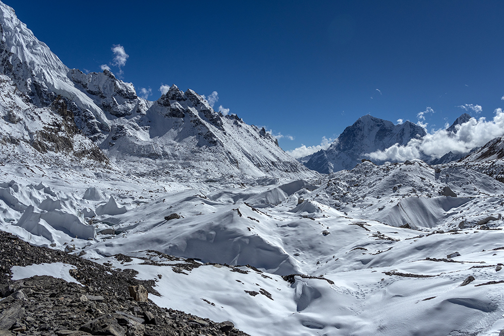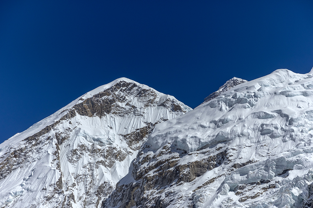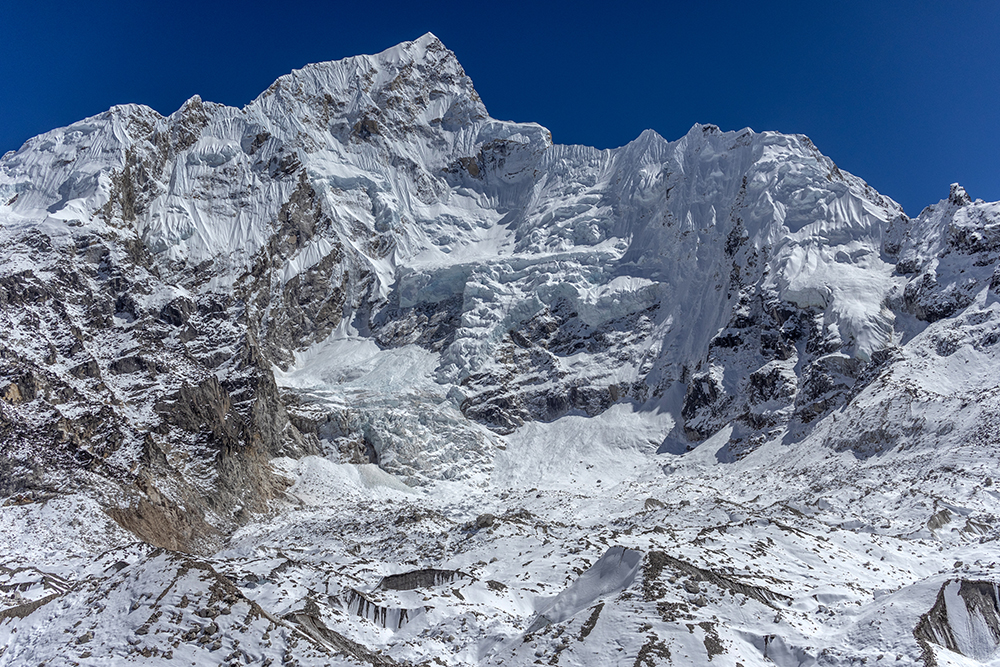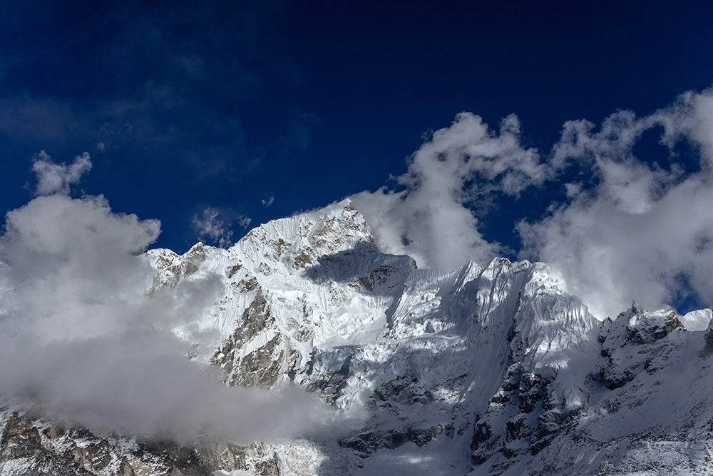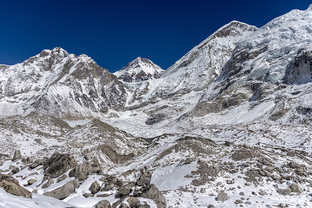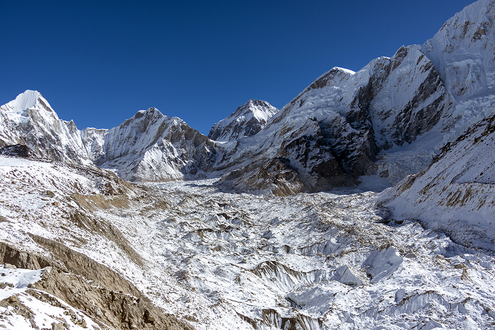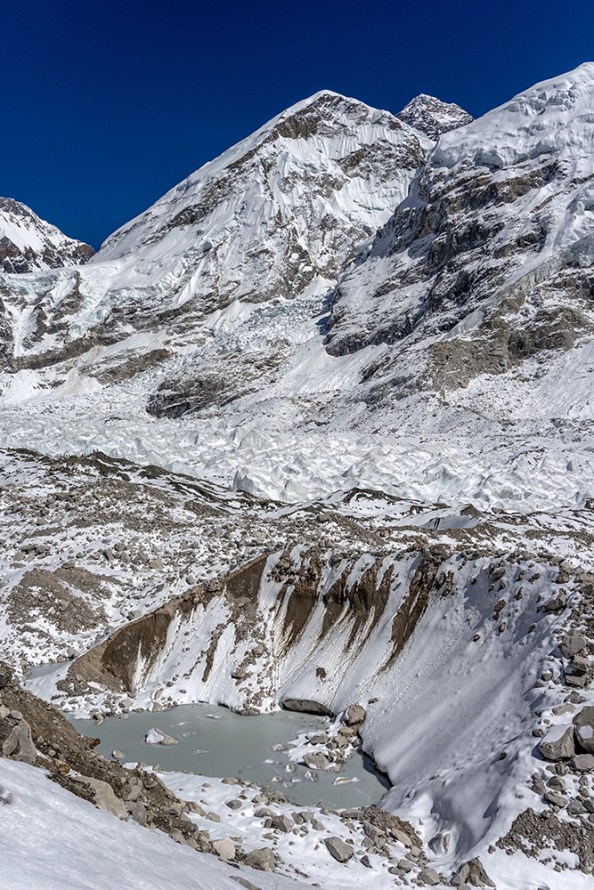 The icy trail cut a path through hard snow, running beneath towering peaks on one side, and the Khumbu Glacier on the other. Gargantuan chunks of ice piled together, punctuated by the occasional pool of stagnant water, opaque with glacial sediment. On the far side of the glacier, Everest’s peak was obscured by her own West Shoulder, and by nearby Nuptse, whose marble-colored ridge looked as though it had been carved by a master sculptor.