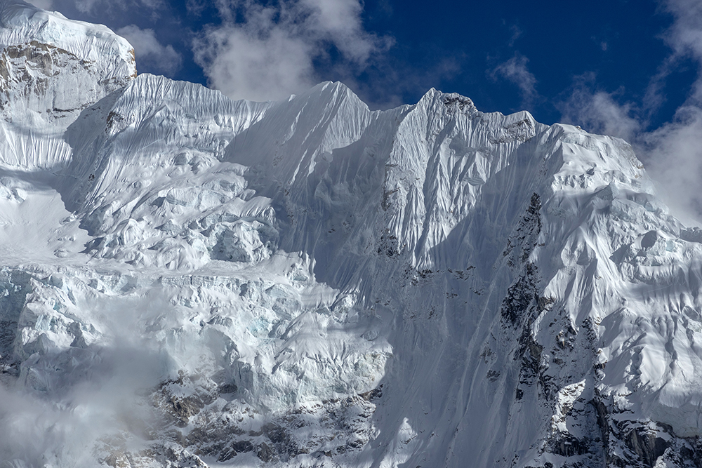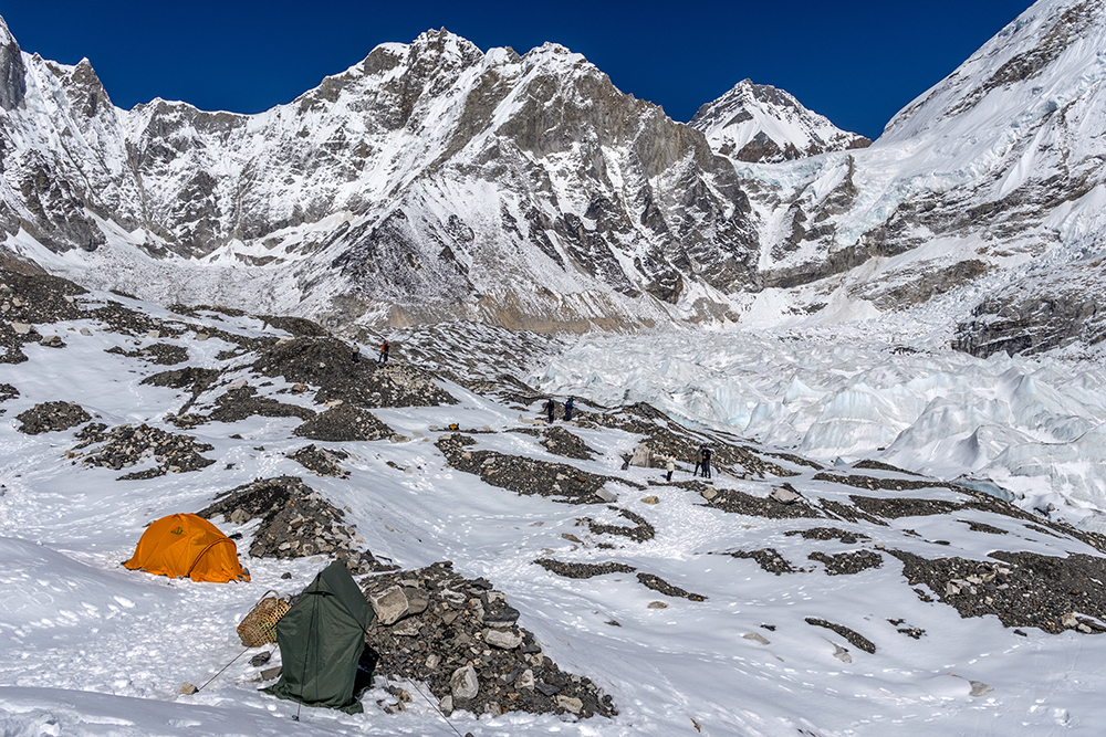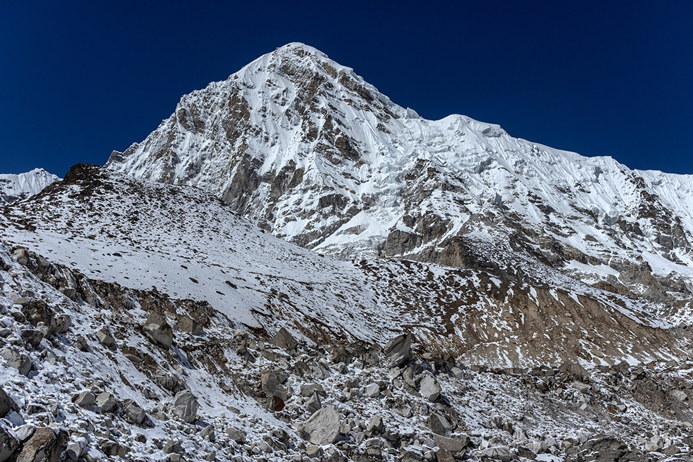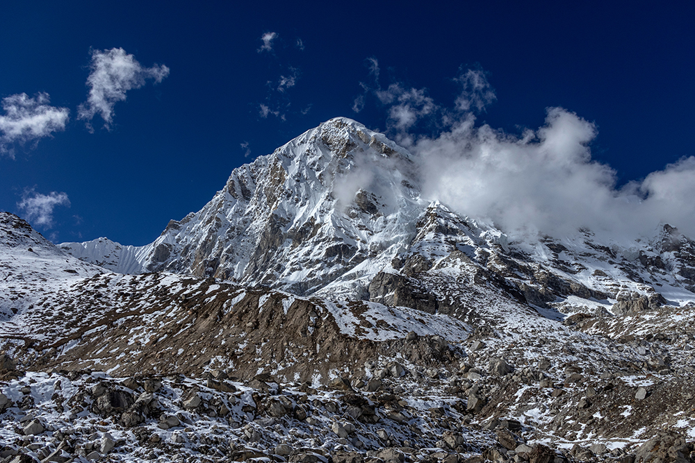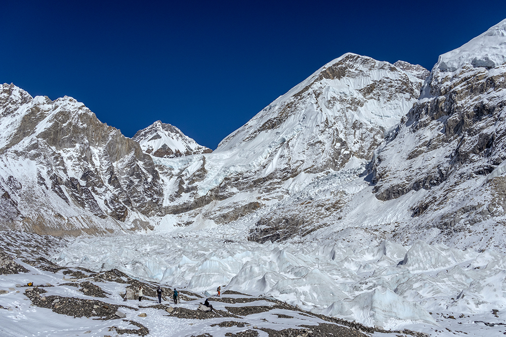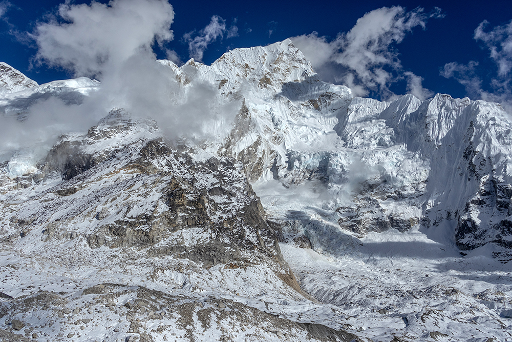 The icy trail cut a path through hard snow, running beneath towering peaks on one side, and the Khumbu Glacier on the other. Gargantuan chunks of ice piled together, punctuated by the occasional pool of stagnant water, opaque with glacial sediment. On the far side of the glacier, Everest’s peak was obscured by her own West Shoulder, and by nearby Nuptse, whose marble-colored ridge looked as though it had been carved by a master sculptor.