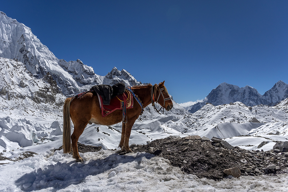 Everyone spent our remaining time at Base Camp posing for more pictures, and we all passed around a “send” beer that Kennedy had packed specifically for this moment. But wispy clouds started to gather over what had been a completely clear sky all day, a signal that it was time to get moving again if we wanted to make it back to Gorak Shep before dark. Reluctantly, I heaved my day pack onto my back, and took my place in line to start trekking. As we left Base Camp, we passed by a few horses who had been brought out so that exhausted trekkers could hire them, and then we were back on the trail.