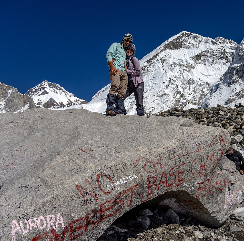 Suddenly, the trail veered off to the right, and the form of a large, strangely shaped boulder could be seen up ahead. The rock was covered in graffiti, and surrounded by people. We’d finally made it to Base Camp at 17,598 feet (5,364 meters).
