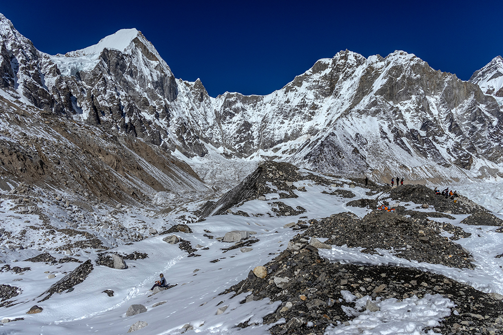 We started hiking again, and PG walked up beside me. With a sweeping gesture to our right he said, “It’s the Khumbu Glacier,” and pointing far into the distance, he added, “and that’s Base Camp.”