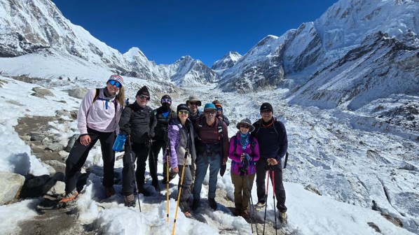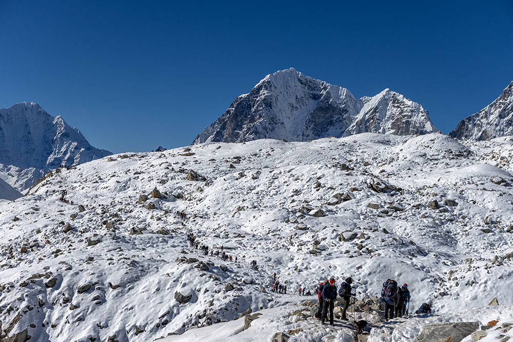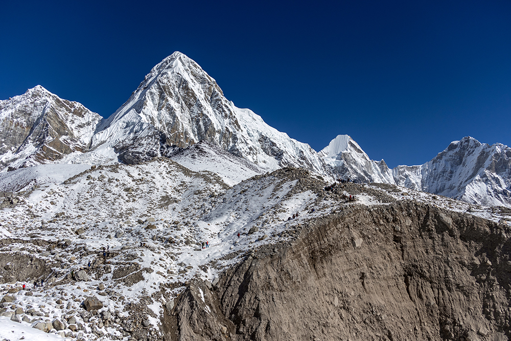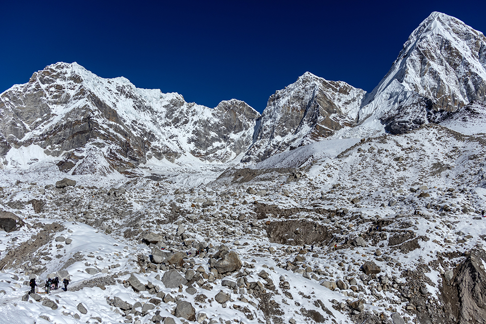 My iTrekEVEREST teammates and I had gotten some extra time to sleep that morning since we’d all agreed not to attempt Kala Patthar. By the time we left our teahouse in Gorak Shep, the sun was already rising in the sky, which meant that hiking conditions were comfortably warm as the little settlement shrunk into the distance behind us. A large part of me was relieved to be heading to a lower elevation. As it turns out, life in thin air is mildly miserable in between the highs of seeing some of the most incredible mountains on earth. Just now though, all the discomfort was fading into the background as we trekked beside the Khumbu Glacier for the last time.