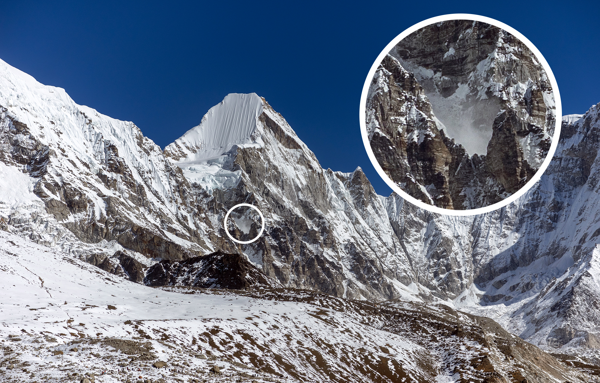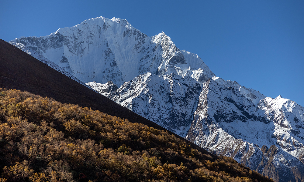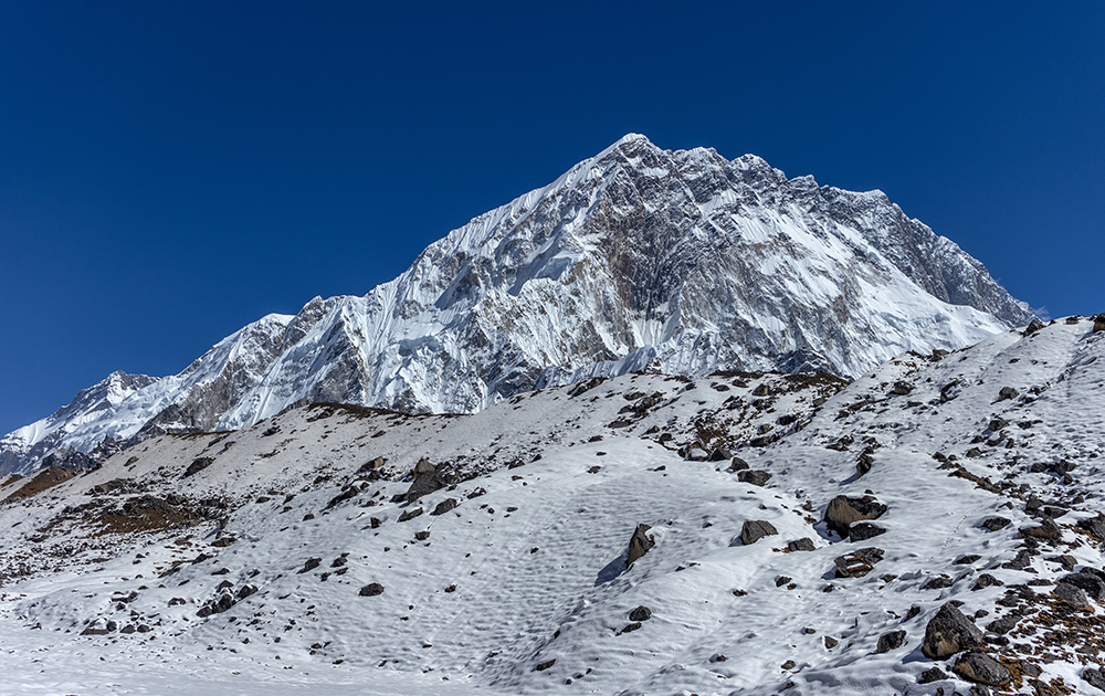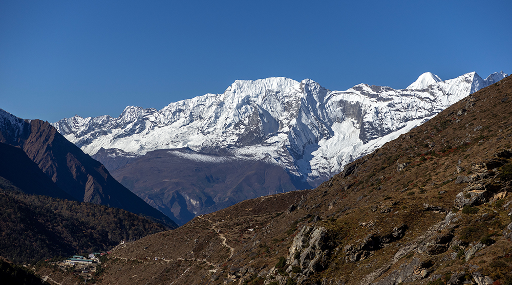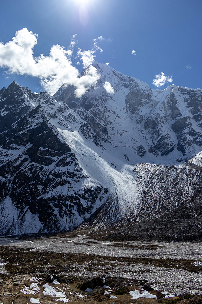 Once the yaks were through, the scene dissolved back into a line of trekkers making their way through the snow. I got back in line with them, but it wasn’t long before a loud bang shuddered through the valley and echoed off the surrounding mountains so it seemed as though the sound was coming from every direction. Nobody needed to tell me what that sound was. I may not have ever witnessed one before, but I knew deep in my gut that it was an avalanche. I turned around and after a bit of searching, spotted a cloud of snow on the side of Lingtren, a peak that sits on the border between Nepal and China.