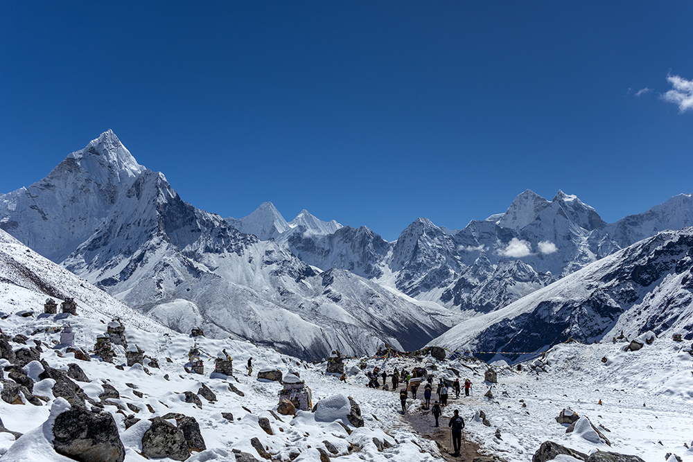 Once we left the glacier, the trail flattened out considerably, and we put our heads down and hoofed it all the way back to Lobuche. It’s amazing how much faster you can walk when you’re headed downhill at high altitude. After a quick break in Lobuche, we got back on the trail, and kept walking until we arrived at the Climber’s Memorial at Thukla Pass. By this point, I was beginning to feel gassed out. It had been about four days since I’d eaten a square meal (I’d lost my appetite completely at altitude), so my energy reserves were running very low. But thankfully, our arrival at Thukla Pass meant it was almost time for lunch.