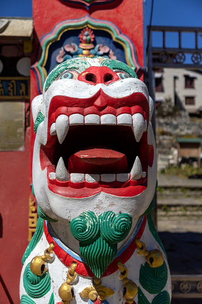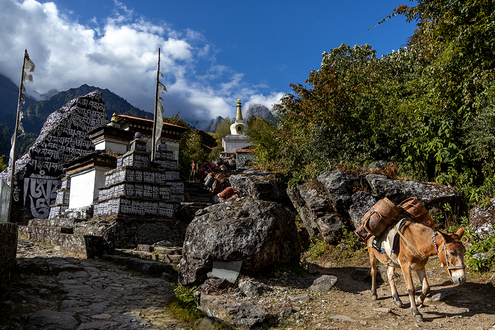 Before long, we reached the entrance gate to Sagarmatha National Park, and I felt a pang in my heart at having to leave. The shift in atmosphere was almost immediate upon leaving the park. The small mountain villages seemed like bustling cities compared to the peaceful settlements beyond the park gate. It turned out that we were hiking on the biggest shipping day of the week, so huge trains of mules dominated the road, carrying heavy loads of supplies and gas cannisters.