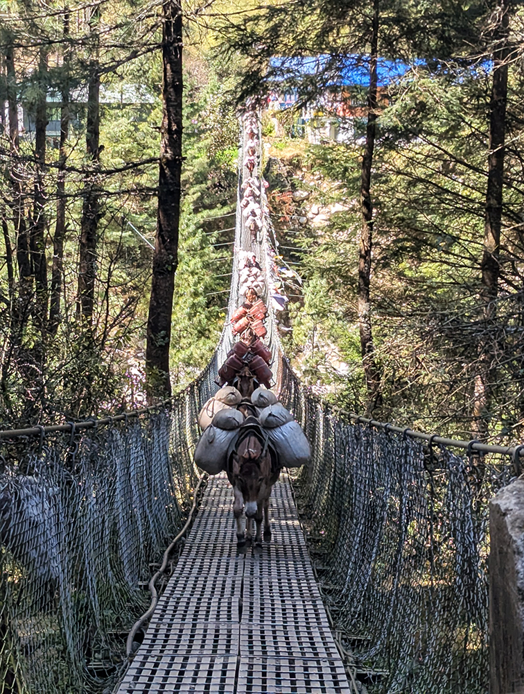 From the park gate onward, the rhythm of the day became one of walking a handful of meters, then stopping to let a bunch of mules pass, then walking a little ways further, then stopping for more mules. At one point we got held up at a suspension bridge, and had to wait as probably a hundred mules crossed over it. Once the last one stepped off the bridge, we hurried to claim it before any more mule trains could arrive.